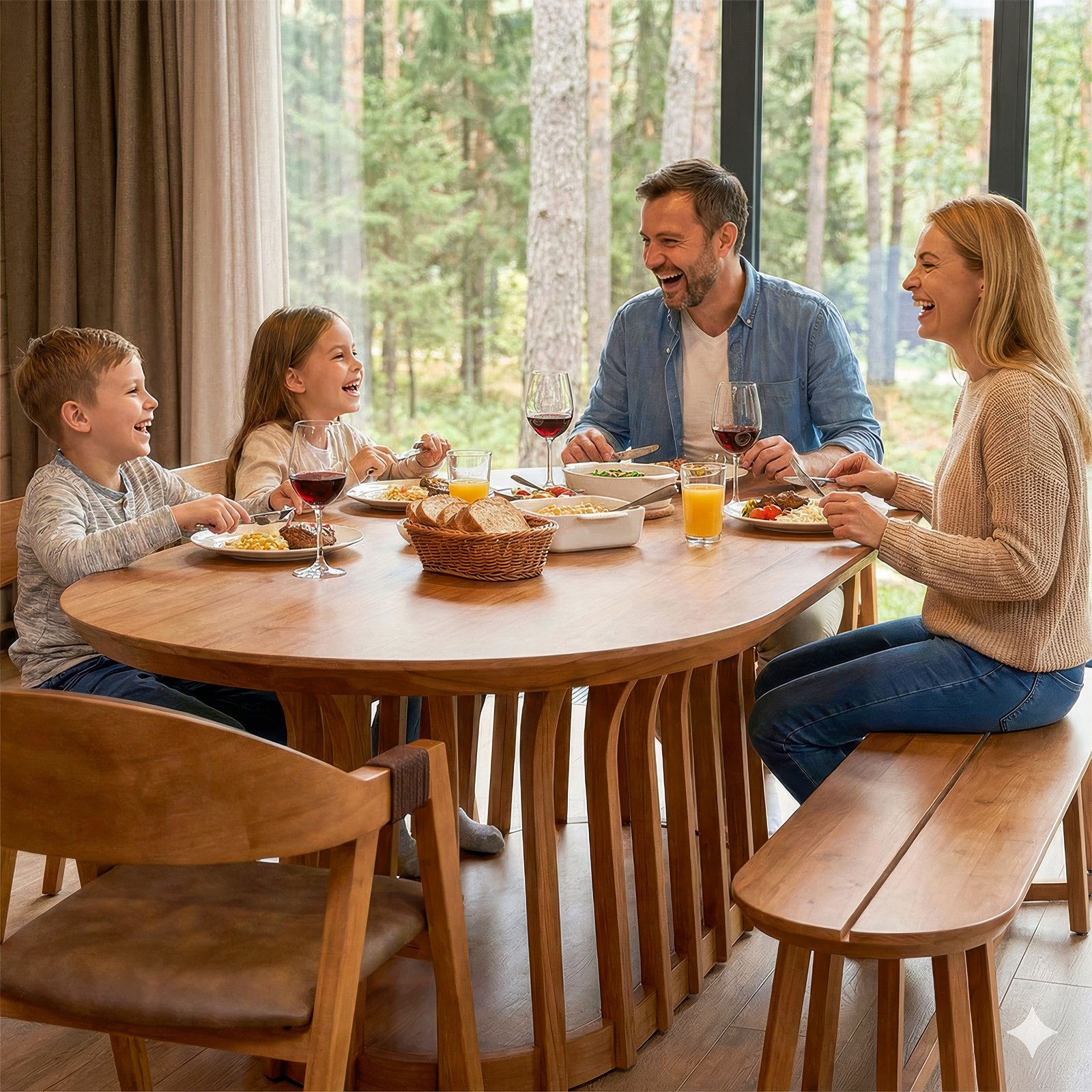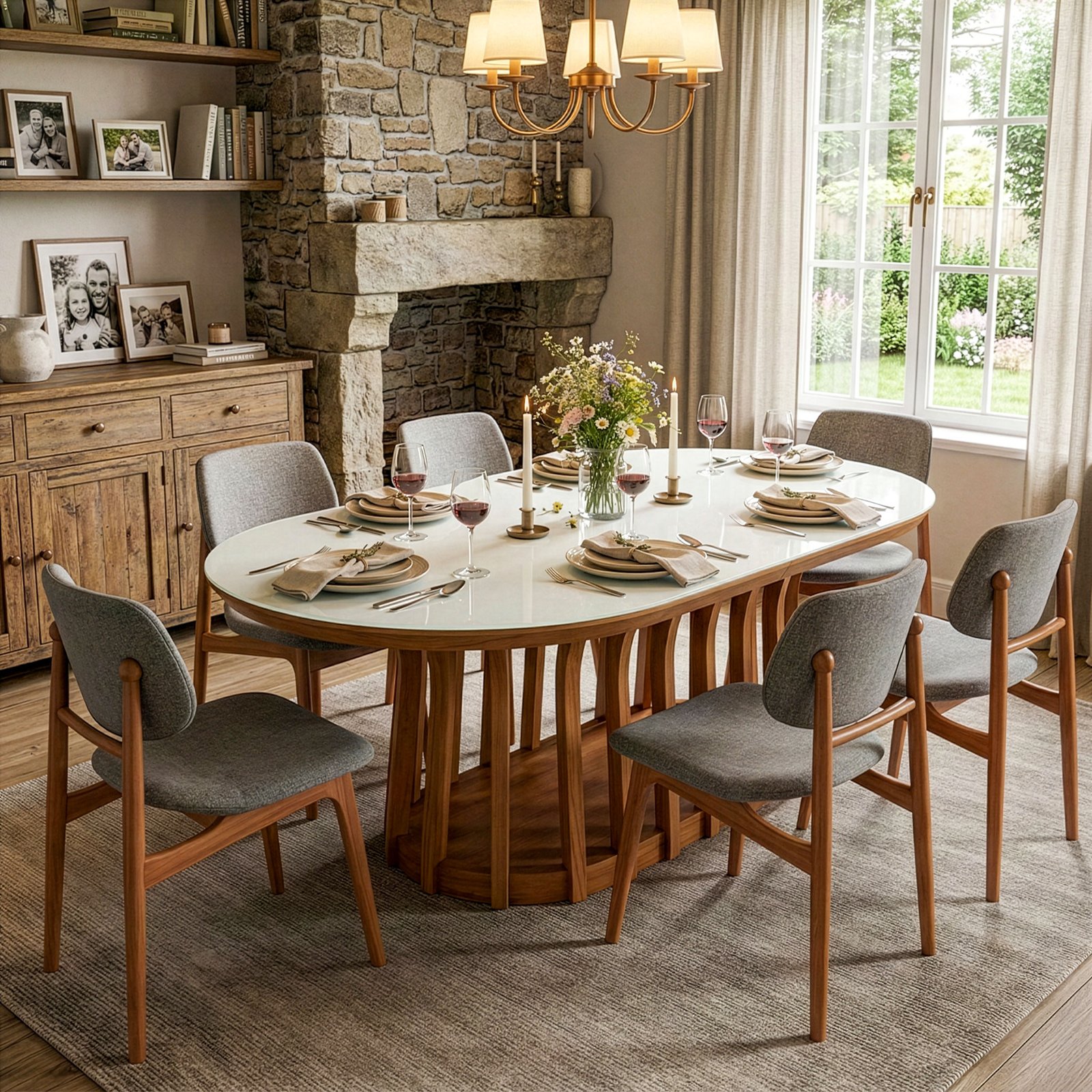 da mesa e a elegância dos materiais utilizados, como a madeira e o vidro.